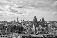 Vanaf het dakterras van het Hilton hotel naast van Centraal Station in Amsterdam heb je een prachtig zich op de oude stad. Op de voorgrond zijn de torens van de Sint Nicolaas basiliek te zien. Tussen de torens door is de beroemde Westerkerk te zien.