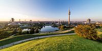 Panorama Olympisch Stadion en de Olympische Toren in het Olympisch Park op het Olympisch terrein in München. Rechts de BMW wolkenkrabber, ook bekend als de BMW Viercilinder of BMW Toren, het hoofdkantoor van BMW.