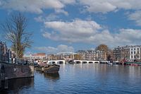 Dit werk toont een panoramisch beeld over de Amstel. De beroemdste brug van Amsterdam is de houten brug over de Amstel. De brug wordt de magere brug genoemd, een verwijzing naar een eerdere smalle brug die in 1934 werd vervangen door de huidige. In de avonduren is de brug versierd met brandende lampjes. De foto is genomen vanaf de rechterzijde van de Amstel. Op de voorgrond een rijnaak die als woonboot in gebruik is genomen. De lucht prachtig gevuld met witte wolken tegen een blauwe lucht. De werk is zowel in kleur als zwart-wit te bestellen.
