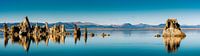 Panorama van de weerspiegeling van kalkhoudende tufsteenformaties in Mono Lake in de Sierra Nevada van Californië in de VS in blauw