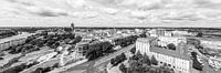 Zwart-wit fotografie panorama stadscentrum met de rivier de Elbe, Magdeburger Dom, Allee-Centrum en Alter Markt vanuit vogelperspectief, Magdeburg, Saksen-Anhalt, Duitsland.