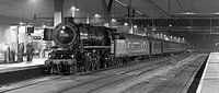 Panorama stoomtrein in Rotterdam Centraal zwart / wit.