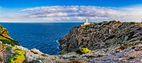 Koop de foto Panorama uitzicht op vuurtoren in Cala Ratjada op mooie rotsachtige kust op Mallorca van Alex Winter op canvas, aluminium dibond, (ingelijste) fotoprint, behang en ArtFrame, op maat geprint in Fine-Art kwaliteit.