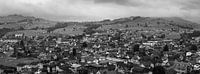 Een weids Zwart-Wit panorama beeld in 65:24 Xpan formaat van een avond met uitzicht over de stad Appenzell, gelegen in het kanton Appenzell Innerrhoden in het noordoosten van Zwitserland tegen de grens met Oostenrijk, Liechtenstein en Duitsland.