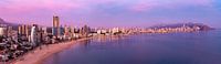 Benidorm is een hele populaire en drukke vakantiebestemming aan de Spaanse Costa Blanca. De stad wordt gekenmerkt door de vele wolkenkrabbers langs de kust, en dat levert dan ook mooie panoramabeelden op, vooral tegen zonsondergang, zoals deze foto die genomen is vanaf Tossa de la Cala.