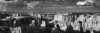 Een weids 3:1 panorama beeld in zwart-wit van een zonsondergang bij Coal Mine Canyon, niet ver van Tuba City, in het noordoostelijke deel van Arizona, in het zuidwesten van Amerika.
