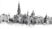 Skyline, Architectuur, Tekening, Kerktoren, Nederland, Gotisch, Stadsgezicht, Monochroom, Barok, Illustratie, Schets, Gebouw, Architectuur, Tekening, Kerk, Toren, Nederland, Gotisch, Stadsgezicht, Schets, Gebouw, Historisch, Panorama, Europa, Middeleeuws, Torens, Stedelijk, Daken, Gedetailleerd, Vintage