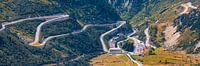 Een 3:1 panoramafoto van rechts de afdaling vanaf de Grimselpas en links omhoog naar de Furkapas met in het midden het bergdorp Gletsch in de gemeente Obergoms het Zwitserse Wallis, een gehucht dat bestaat uit een groot oud luxehotel met bergstation en een anglicaanse kapel. Het maakt deel uit van het dorp Oberwald.