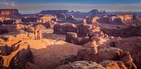 Een panorama beeld van een zonsopkomst met het uitzicht vanaf Hunts Mesa in Monument Valley, gelegen in de Navajo Nation op de grens van Utah en Arizona in het Amerikaanse zuidwesten.