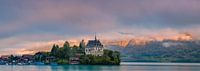 Een weids panorama beeld van een vroege zomer zonsopkomst in Iseltwald, een van de pareltjes van Zwitserland.