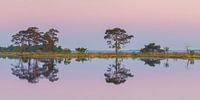 Een weids 2:1 panorama beeld van een vroege ochtend nog voor zonsopkomst met reflecties van bomen bij de waterplas Kraloo in het Nationaal Park Dwingelderveld, het grootste natte heidegebied van West-Europa. Gelegen in de Nederlandse provincie Drenthe, in de driehoek Dwingeloo, Ruinen en Beilen.