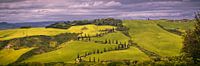 Een weids 3:1 panorama beeld van het beroemde landschap met kronkelende met cipressen omzoomde weg nabij La Foce, Toscane, midden-Italië.