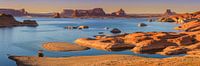 Een weids 3:1 panorama beeld van een serene vroege ochtend tijdens zonsopgang met uitzicht over de Padre Bay op Lake Powell en het uitzicht vandaar is gewoonweg adembenemend.
