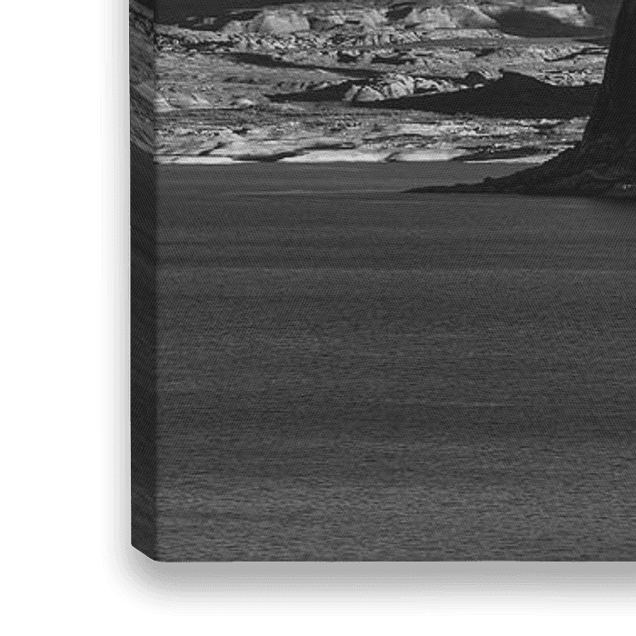 Een weids 3:1 panorama beeld in zwart-wit tijdens zonsondergang gezien vanaf de Padre Bay op Lake Powell, gelegen op de grens van Utah en Arizona in het zuidwesten van de Verenigde Staten.