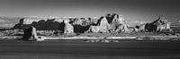 Een weids 3:1 panorama beeld in zwart-wit tijdens zonsondergang gezien vanaf de Padre Bay op Lake Powell, gelegen op de grens van Utah en Arizona in het zuidwesten van de Verenigde Staten.