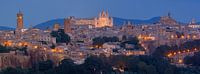 De diepblauwe lucht contrasteert prachtig met de warme gouden tinten van de verlichte gebouwen, wat een magische balans creëert tussen dag en nacht.