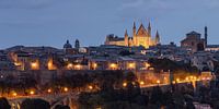 De diepblauwe lucht contrasteert prachtig met de warme gouden tinten van de verlichte gebouwen, wat een magische balans creëert tussen dag en nacht.