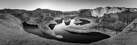 Een weids 3:1 panorama beeld in zwart-wit tijdens een zonsopkomst bij Reflection Canyon op Lake Powell in Glen Canyon National Recreation Area, op de grens van Arizona en Utah, in het zuidwesten van de Verenigde Staten.