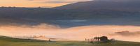 Een weids 3:1 panorama beeld van een zonsopkomst met nevel en mist in warm ochtendlicht tussen de plaatsen Pienza en San Quirico d' Orcia in het Toscaanse landschap van Val d'Orcia, in midden-Italië.