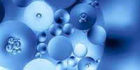 "Blauwe cirkels in een cirkel" is een macrofoto van oliedruppels op water, Deze foto is vervolgens bewerkt tot een bijna grafische weergave in blauwe tinten en bijgesneden tot panoramaformaat.
