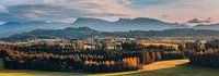 Een weids panoramabeeld van avondlicht met herfstkleuren in de Allgäu, in Beieren, in het zuiden van Duitsland. Dit landschap ligt in de nabijheid van Seeg en Rückholz, niet ver van Hopfen am See en de Hopfensee, met de Allgäuer Alpen in de achtergrond.