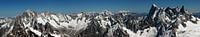 Een 180° panoramisch uitzicht op de Alpen in de zomer, tussen Frankrijk, Zwitserland en Italië. Uitzicht vanaf het Mont-Blanc-massief in Chamonix Frankrijk.