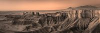 Een weids 3:1 panorama beeld met minimale kleuren met een overzicht op de Badlands bij zonsopkomst. Gelegen in het zuidelijke deel van de staat Utah, nabij Hanksville, Verenigde Staten.