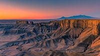 Een groot panorama beeld met een overzicht van de Badlands bij zonsopgang, in het zuidelijke deel van Utah, nabij Hanksville. Verenigde Staten.