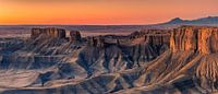 Een groot panorama beeld met een overzicht van de Badlands bij zonsopgang, in het zuidelijke deel van Utah, nabij Hanksville. Verenigde Staten.