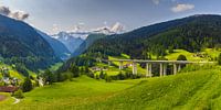 Een 2:1 panorama foto van de Brennerpas, kortweg Brenner (Italiaans: Passo del Brennero), een bergpas (autosnelweg met tol) door de Tiroler Alpen die de grens vormt tussen Italië en Oostenrijk.