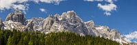 Een weids 3:1 panorama beeld van het Dolomieten gebergte in het voorjaar met de laatste restanten sneeuw op de bergen.