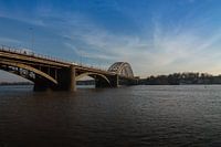 Mooi panorama van de Waalbrug bij Nijmegen, Holland. Blauwe lucht, zonnige hemel. Hoogwater in januari 2018. Iconisch landmark van de regio. Vierdaagse loopt over deze prachtige constructie.