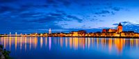 Panorama van de stad Kampen aan de IJssel in Overijssel in de avond. De lichtjes van de Hanzestad worden gereflecteerd in het kalme water terwijl wolken in de lucht langzaam overdrijven.