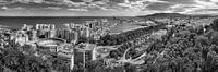 De stad Malaga op een schitterende zomerdag. Panorama van de prachtige stad met zijn vele bezienswaardigheden zoals de kathedraal, het koninklijk paleis Alcazaba of de imposante Stier Camparena. Stadsgezicht als panoramafoto in zwart-wit 90310336ays