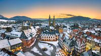 Panoramisch uitzicht op een winterse zonsondergang op het marktplein in Goslar, Duitsland
