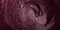"Panorama van druppels op een oud roze bloem" is een bewerkte macrofoto van een roze Ranonkel waarbij de blaadjes nog net niet allemaal open zijn gegaan. Op deze bloemblaadjes liggen waterdruppels.