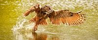 Panorama van een Oehoe, deze vliegt met uitgespreide vleugels boven een groen meer. Veel water gespetter, met reflectie in het water. De wollige poten raken het water om de prooi te pakken.