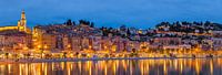 Een weids 3:1 panorama beeld van een avond na zonsondergang in de kleurrijke stad Menton, een Franse gemeente en stad gelegen in het departement Alpes-Maritimes en de regio Provence-Alpes-Côte d'Azur, gelegen aan de Cote d'Azur in het zuiden van Frankrijk aan de Middellandse Zee.