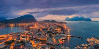 Een weids 2:1 panorama beeld met uitzicht over de stad Ålesund, gelegen in de provincie Møre og Romsdal tijdens de schemering, gezien vanaf het uitkijkpunt op de berg Aksla.