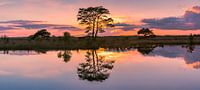 Zonsondergang in Nationaal Park Dwingelderveld, het grootste natte heidegebied van West-Europa. Gelegen in de Nederlandse provincie Drenthe, in de driehoek Dwingeloo, Ruinen en Beilen. Natte laagtes en hoge zandruggen wisselen elkaar af in het uitgestrekte Dwingelderveld. Je vindt er heide, bos, jeneverbesbosjes, stuifzand en ruim veertig vennen. Een deel van die vennen is ontstaan in de ijstijd, andere zijn het resultaat van veenafgravingen.