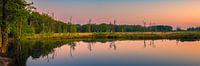 Een 3:1 panorama foto van een warme sfeervolle zonsopkomst bij natuurgebied Appelbergen, een prachtig stuk natuur in Glimmen, op de grens van Drenthe en Groningen.