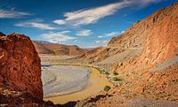 Panorama van het Atlas gebergte. Marokko. Doorkijkje tussen de rotsen. De rivier staat bijna droog. De foto is gemaakt in de omgeving van de Todra kloof. Midden Atlas.