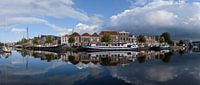 Groot panorama van het Binnen Spaarne in Haarlem vroeg in de ochtend met zware wolkenlucht en weerspiegeling in het water met schepen.
