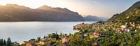 Op de foto zie je de stad Malcesine omringd door bergen en het typische Italiaanse landschap en mediterrane vegetatie met palmbomen, olijfbomen en citroenbomen.
