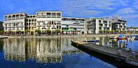 Gezicht op de skyline van Dortmund met de Phönix See in Dortmund Hörde, bestaande uit verschillende foto's.