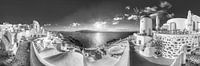 Bij zonsondergang kunt u hier comfortabel zitten, genieten van een cappuchino en kijken naar de warme schittering van de zon op de zee. Panoramafoto in zwart-wit 90310134ays
