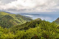 Panorama van het kustlandschap op het Seychellen eiland Mahé met beboste heuvels en de Indische Oceaan op de achtergrond