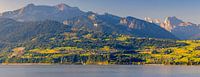 Een weids panorama beeld van een mooie zomerochtend aan het meer van Thun. De plaatsen Spiez, Faulensee en Krattigen zijn ook een mooi aandachtspunt in dit overweldigend landschap in het Berner Oberland gezien vanuit Gunten en Sigriswil in centraal Zwitserland.