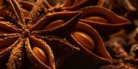 "Panorama van "in de keuken": Steranijs (close-up)" is een macrofoto van 2 steranijs liggend op een verzameling steranijs. Deze specerij heeft van zichzelf al een mooie warme bruin oranje kleur, wat zorgt voor een natuurlijke warme uitstraling.