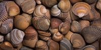 "Panorama van schelpen in allerlei bruin tinten" is een foto van een verzameling van allerlei verschillende kleuren en formaten schelpen met ribbeltjes. De kleuren lopen uiteen van wit - creme kleur tot bruin zwart. Deze foto is bijgesneden tot panoramaformaat.